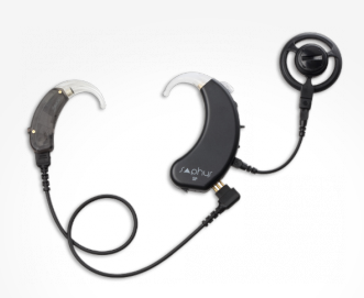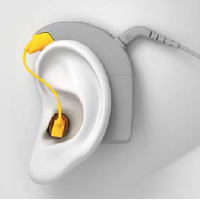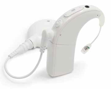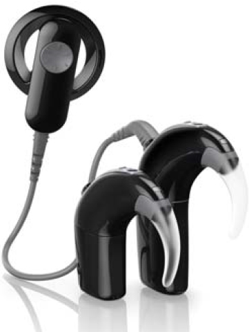 This French cochlear implant manufacturer has a time slot to provide an update at the conference as well. The current system from Neurelec is very creative – one implant has two arrays, one for each cochlea! Externally, the Saphyr processor sits on one ear, and a wired microphone is on the other ear. This system provides true stereo sound.