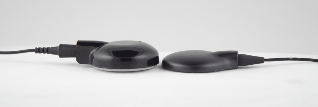 The M Slim HeadPiece now has a permanently-attached cable. This was the design of the older generation Harmony processor’s headpiece and cable, which in my experience made for a robust design that required changing only once during a 7 year period. The design is much thinner and lays flat against the head compared to the Universal HeadPiece design with a detachable cable of the previous Q series. The strain relief features on both ends of the cable have also changed. They are smaller, and may provide improved reliability. Numbered magnets are inserted by your audiologist for just the right amount of grip. If you need a very high-strength magnet, a color cap about the same thickness as the UHP is available. The new Slim AquaMic is exactly the same size as the Slim Headpiece.
