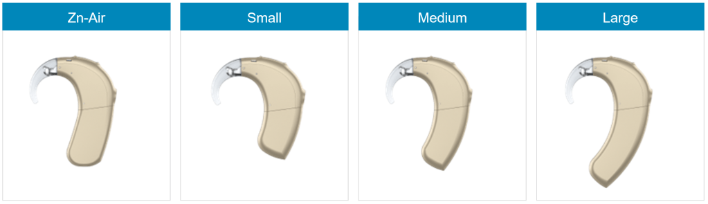 Each of the three rechargeable battery sizes is smaller than the corresponding options for the Q series. A case for disposable Zinc-Air batteries is also available. I got 21 hours of battery life with new 150mAh medium batteries on the M90. With new 170mAh batteries on the Q70, I got about 16 hours. This means the combination of the new processor and software is about 50% more efficient!