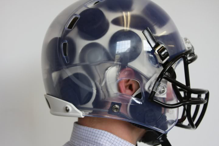 1) The helmet adapts to the players head and the use of adaptive shock absorbers vs. traditional foam both allows for extra room within the helmet shell and is not truly “fitted” until the player snaps his chin straps. In other words the helmet mechanically seeks the countours of each individuals head rather than simply being filled with dense foam.
