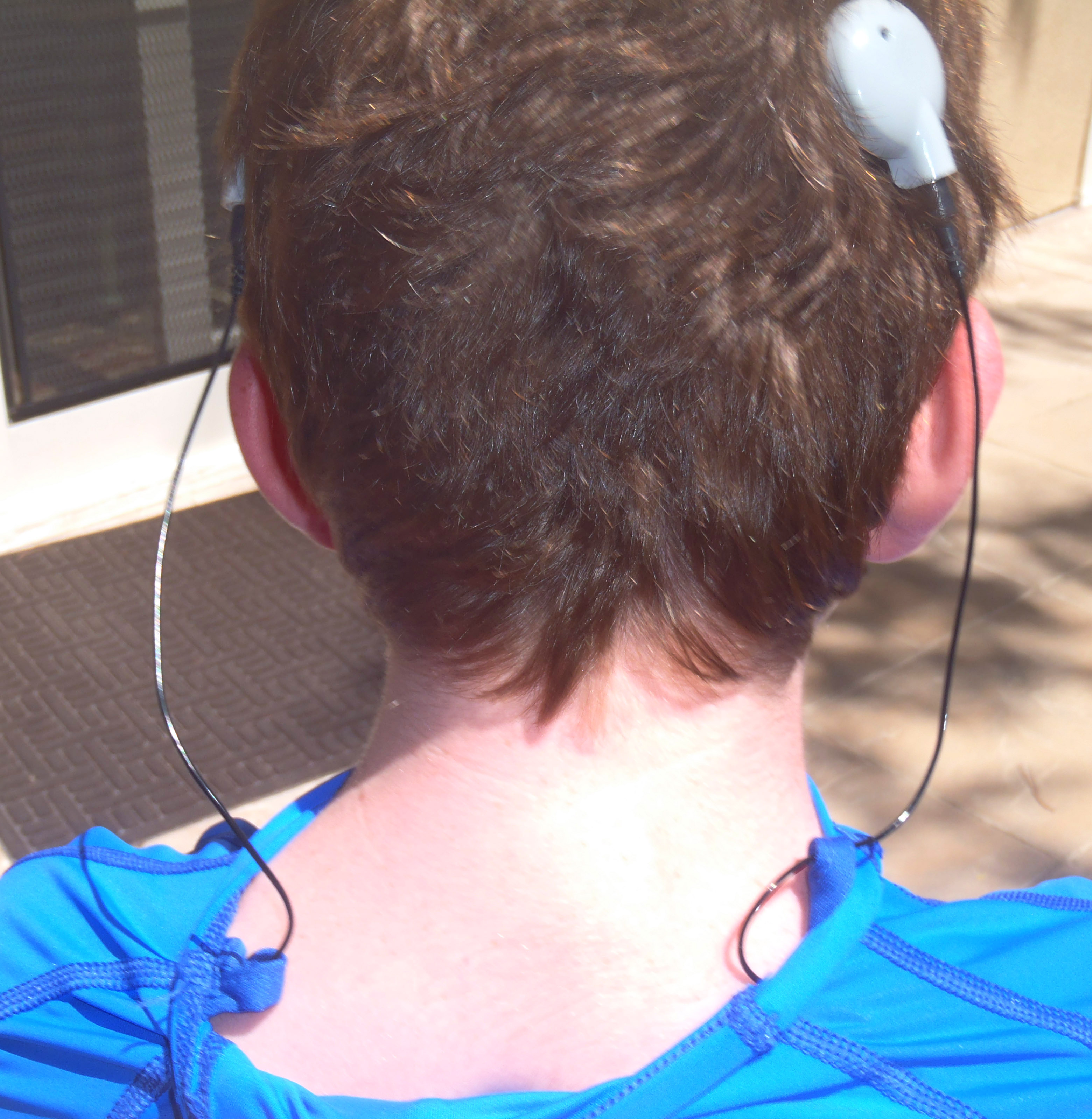 We were sent home with a prototype shirt to try out. The shirt looks and feels like a high-quality rash guard shirt and is well-made. The shirt is very well designed with pockets on each sleeve where the processor can be inserted. There is an elastic band in the pocket where the processor can be clipped for added security. Inside the back of the pocket there is a small hole to thread the cord through, and another loop inside the neckline to thread the cord through which helps keep the cords nicely in place and prevents tangling. The loop in the neckline also helps keep the cord and headpiece in place when the headpiece falls off, making it much easier to find the dislodged headpiece and put it back on. Another nice feature of the shirt is that it isn’t obvious that my kids are even wearing CI processors at all. The CI processors are barely visible when inside the pocket (it just looks like a bump in the shirt), and the cords are nicely concealed inside the shirt and only appear where they come out of the collar.
